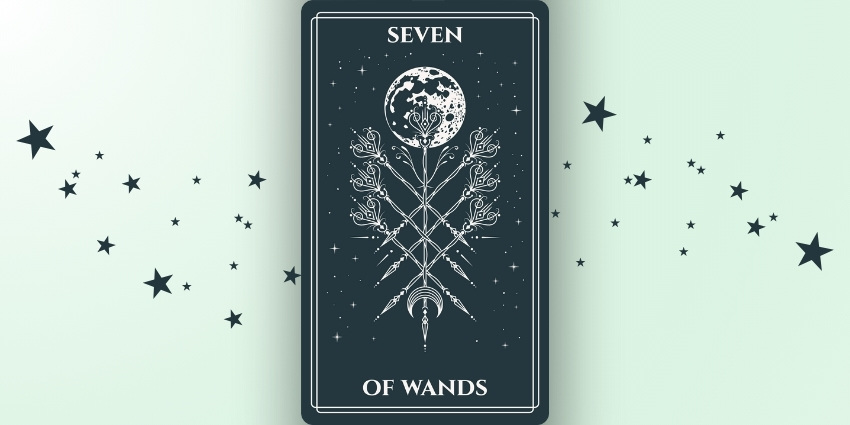 La carte de tarot du Sept de Bâtons représente le fait de rester ferme et de défendre votre position face aux défis. À l'endroit, elle montre le courage et la persévérance ; à l'envers, elle peut indiquer un sentiment d'être submergé et de douter de soi face à l'opposition.