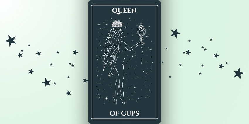Kartu tarot Queen of Cups mewakili kecerdasan emosional, kasih sayang, dan kemampuan psikis. Tegak, dia menawarkan dukungan dan kebijaksanaan; terbalik, dia memperingatkan terhadap ketidakdewasaan emosional atau intuisi yang terblokir.