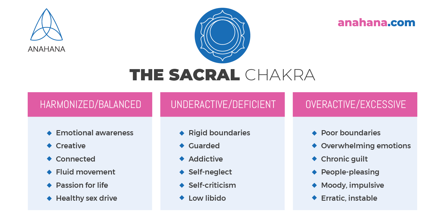 Sakralchakrat förknippas med njutning, sexualitet och glädje. Det stöder känslomässiga och fysiska hälsoaspekter och styr många av kroppens vätskor, från könsorganen, urinblåsan och njurarna.